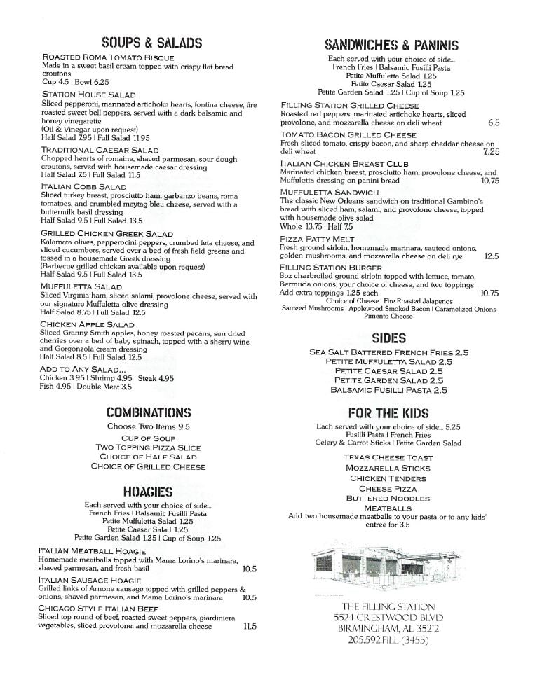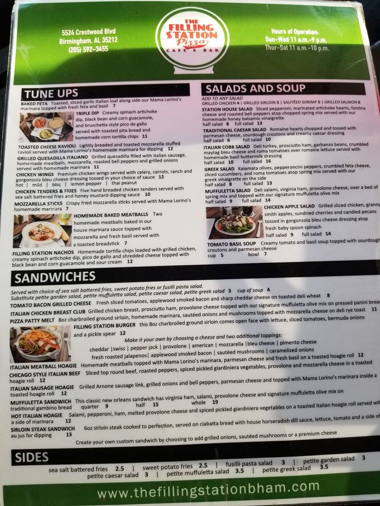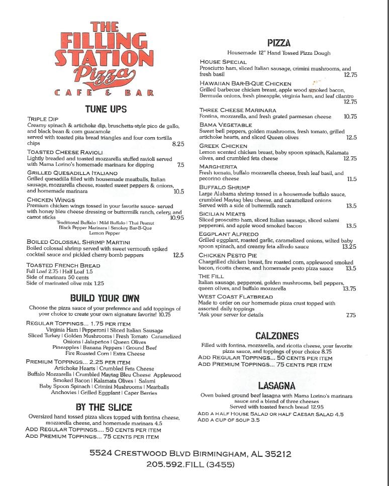 Introducing The Filling Station, an inviting haven for Italian cuisine lovers nestled in Birmingham, AL. This charming establishment specializes in pizza and bars, embracing a warm, casual atmosphere perfect for families and groups alike. With a commitment to accommodating all types of diners, the menu features numerous vegetarian options and delectable dishes like the highly praised buffalo shrimp pizza, which has garnered rave reviews from customers.